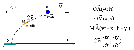 Un avion vole horizontalement à l'altitude h à la vitesse costante notée v. Un missile placé initialement au sol. A l'instant t = 0, l'avion passe à la verticale du missile; le missile décolle en direction de l'avion. la vitesse du misile est le double de celle de l'avion; on suppose que le missile est, à tout instant, dirigé vers l'avion.