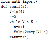 4. Justifier que l’algorithme suivant écrit en langage Python renvoie un résultat quel que soit le choix de la valeur du nombre S.