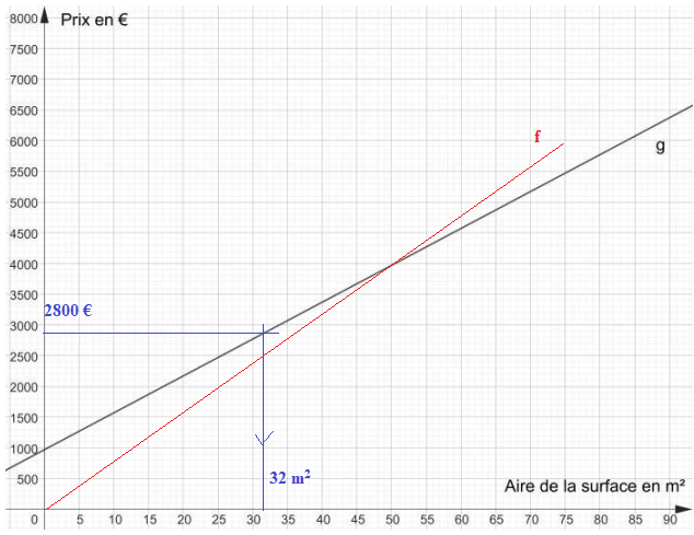 1. Montrer que pour une surface dont l’aire est de 20 m², le prix est de 1 600 € avec le