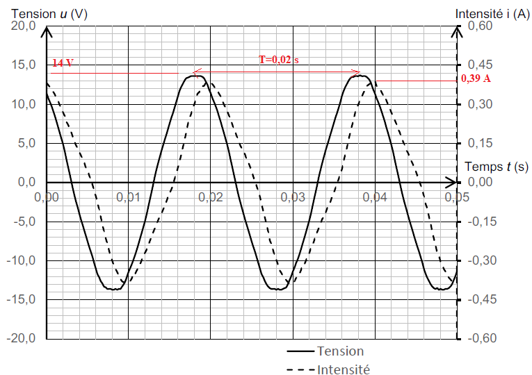On rappelle que pour un courant alternatif sinusoïdal, les valeurs efficaces de la tension et de l’intensité du courant, U