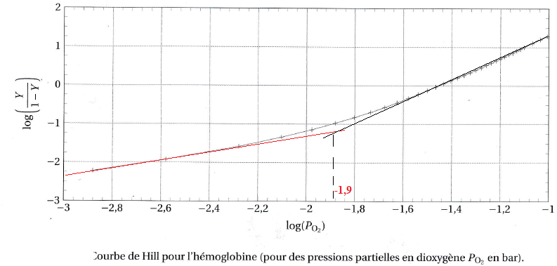 Au point de coordonnée (-1 ; 1,3) : log(Y / (1-Y) = pKD +n log(PO2).
