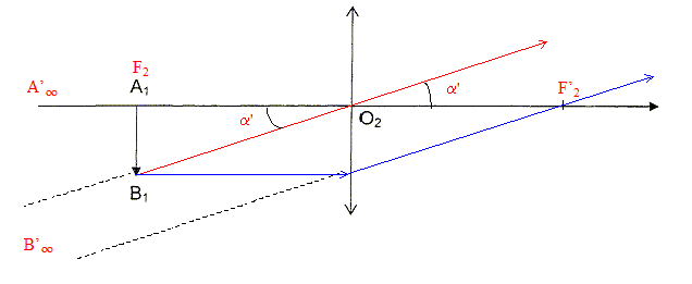 L'indication (x10) gravée sur la monture de l'oculaire est son grossissement G. Le grossissement G d'une lentille est le rapport du diamètre apparent a' de l'image formée par la lentille au diamètre apparent a de l'objet, cet objet étant placé à d = 25 cm de l'il : G =a' / a. Les angles a' et a sont petits : on peut alors écrire tan a ' a' et tan a a. Exprimer le grossissement G2 de l'oculaire en fonction de sa distance focale f'2 et d puis calculer f2'. L'image intermédiaire A1B1 se trouve au foyer F2 de l'oculaire pour obtenir une image définitive A'B' à l'infini.