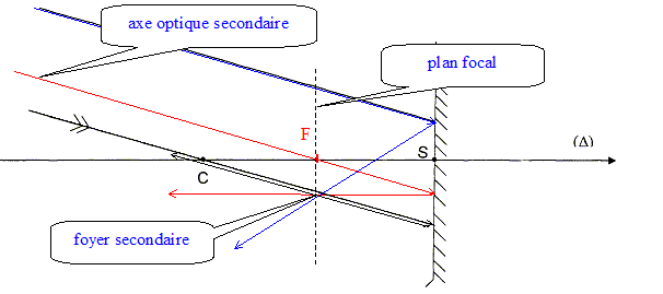 Un miroir sphérique permet de concentrer la lumière d'une source sur la préparation posée sur la platine. Soit (D) l'axe optique principal du miroir et C son centre. En justifiant la réponse, placer sur la figure son foyer principal F. Compléter sur cette figure, la marche des rayons lumineux provenant d'une source lumineuse qui éclaire le miroir. Le foyer est au milieu du segment CS.