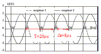 4-1 Déterminer la fréquence des ondes ultrasonores émises. Calculer le retard entre les deux signaux enregistrés (ce retard est inférieur à la période des ondes). 4-3 En déduire la célérité des ondes ultrasonores dans l’eau.