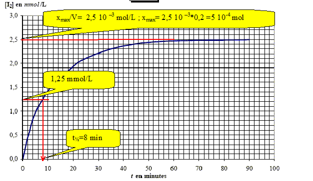 En milieu acide, le peroxyde d’hydrogène réagit avec les ions iodure. L’étude expérimentale montre que la réaction est totale, lente, et permet d’obtenir une mole de diiode (I2) par mole de peroxyde d’hydrogène consommée. Ecrire pour chacun des couples (H2O2/H2O) et (I2/I-) la demi-équation d’oxydoréduction associée. H2O2+2H++ 2e- =2H2O réduction 2I- = I2 + 2e-, oxydation. On se propose d’étudier la cinétique de cette réaction. Pour ce faire, on mélange à l’instant initial les solutions suivantes : - 50 mL d’iodure de potassium de concentration 0,02 mol/L - 100 mL d’acide sulfurique (H2SO4) de concentration 0,05 mol/L - 50 mL de peroxyde d’hydrogène de concentration 0,02 mol/L Ecrire l’équation-bilan de la réaction du peroxyde d’hydrogène sur l’iodure de potassium. H2O2+2H++2I- = I2 +2H2O. Dans cette réaction, quelle est l’espèce chimique oxydante ? L’espèce réductrice ? H2O2 joue le rôle d'oxyant, I- celui de réducteur. Calculer la quantité minimale de peroxyde d’hydrogène nécessaire pour oxyder tout l’iodure. Quel est le réactif limitant ? Quantité de matière initiale : n(I-) = 0,05*0,02 = 10-3 mol ; n(H2O2) =