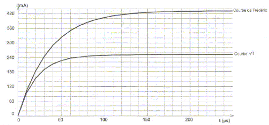 A l'aide d'un tableur, Frédéric continue les calculs jusqu'à l'instant de date t = 500 µs. Il place les valeurs expérimentales i(t) et les valeurs calculées iEuler(t) par la méthode d'Euler sur le graphe ci-dessus. Partie D : Frédéric : " Monsieur, que s'est-il passé ? J'ai une courbe supplémentaire sur mon écran ! " Le professeur : " Pendant que vous faisiez vos calculs à la main, j'ai effectué une nouvelle acquisition. J'ai gardé dans le circuit la bobine de votre woofer et je n'ai modifié qu'une seule grandeur caractéristique du circuit ". Frédéric : " Vous avez changé soit la valeur de la f.e.m. E du générateur, soit la valeur de la résistance réglable R ". Le professeur : " Et oui ! Comparez les constantes de temps des deux courbes et vous trouverez ce que j'ai modifié dans votre montage ". La courbe obtenue par le professeur est représentée ci-dessous :