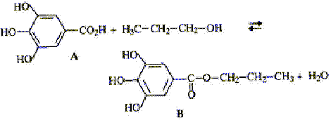 Par réaction entre l'acide gallique A et le propan-1-ol on obtient le gallate de propyle B qui est un antioxydant. ![]() masse molaire A = 170 g/mol ; masse molaire B= 212 g/mol ;